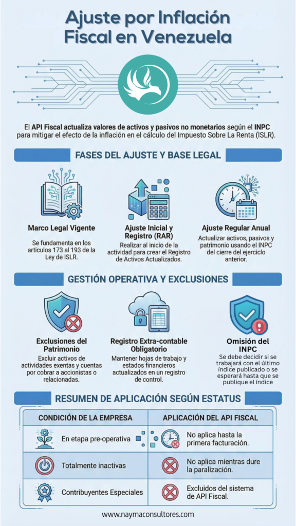 El API Fiscal está fundamentado en el Título IX, Artículos 173 al 193 de la Ley del Impuesto Sobre La Renta (ISLR) y en el Título II, Capítulo V, Artículos 90 al 123 del Reglamento de la Ley del Impuesto Sobre La Renta. Fue instaurado en 1991 para mitigar los efectos de la inflación en el patrimonio de las empresas.
