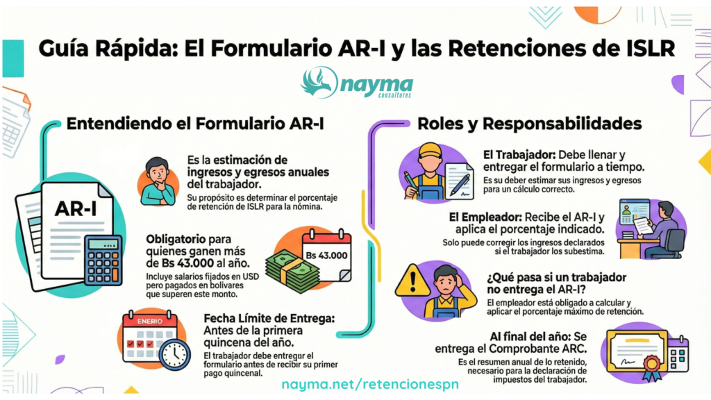 La forma AR-I es una planilla oficial del SENIAT donde el trabajador estima sus ingresos y sus gastos con el fin de obtener el porcentaje de retención de ISLR que su empleador debe aplicar en la oportunidad del pago de su sueldo o salario.