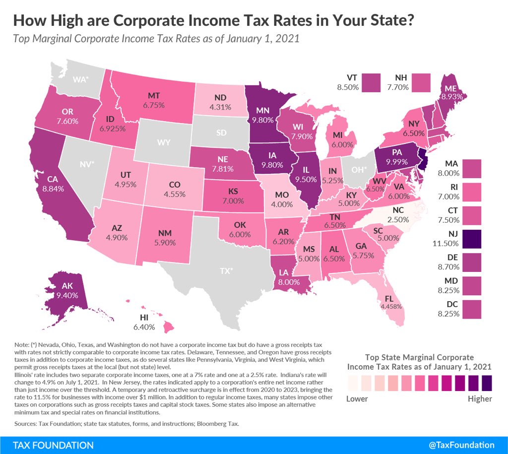 Es cierto que las entidades domiciliadas en Delaware no tributan por los beneficios obtenidos fuera del estado de DE en el Impuesto de Sociedades (IS) estatal (8,7%). Pero como se puede ver en este mapa con los tipos impositivos estatales por IS, la mayoría de estados tienen tipos inferiores al 8,7% y en varios estados el tipo es el 0%