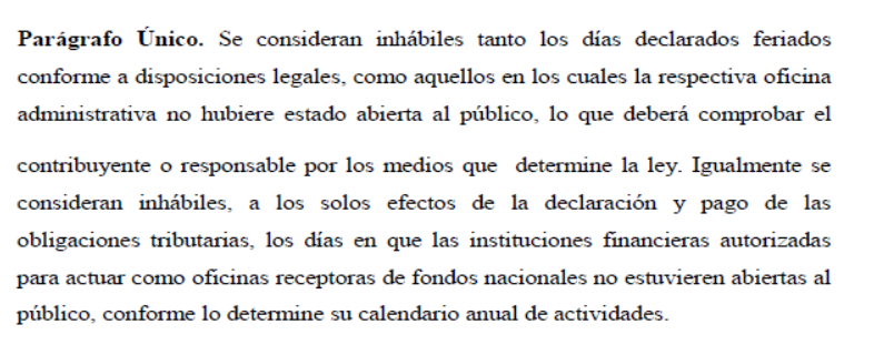 La base legal se encuentra en el artículo 10, parágrafo único, del Código Orgánico Tributario (COT), el cual establece que el contribuyente debe demostrar que la oficina de la administración tributaria no estuvo abierta al público.